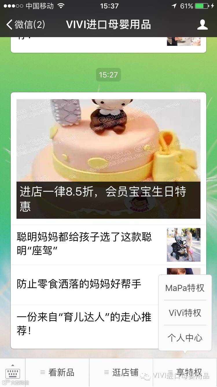 喜大普奔!为了感谢广大用户对ViViBaby和mamas&papas的支持和厚爱,我们会在宝宝生日当天,发送生日祝福短信。在收到短信后的3天内到店内消费可享受8.5折优惠,在享受折扣优惠的同时,还可以累积积分,积分累积到一定数值即可兑换现金好礼!两个品牌专柜的积分和余额可以通用哟!