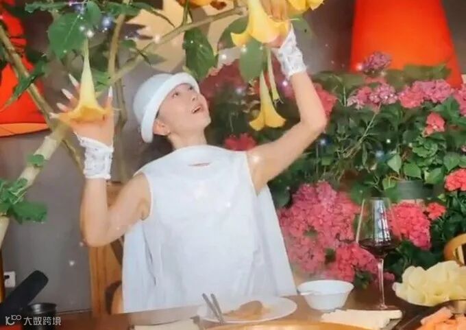 视频中的杨丽萍坐在布满鲜花的室内,穿了一身飘逸的白色长裙,面前是满满的一锅红油锅火锅汤底,画面美感十足。