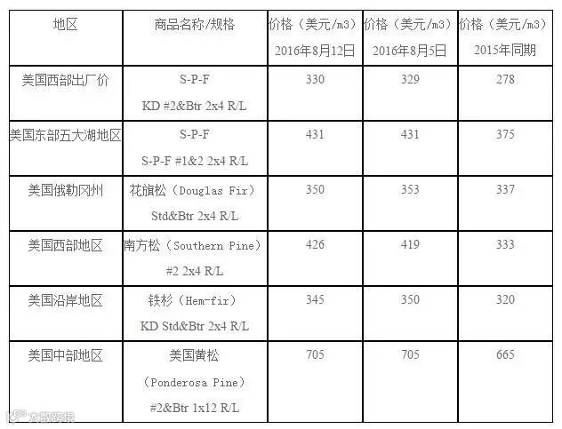二、2016年8月中上旬美国当地锯材价格