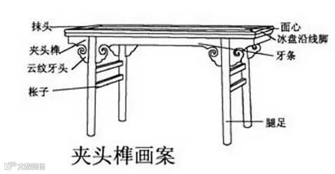 虽然外观与夹头榫不同,但结构实质是相似的,也是足腿顶端出榫,与案面底的卯眼相对拢,上部也开口,嵌夹牙条。