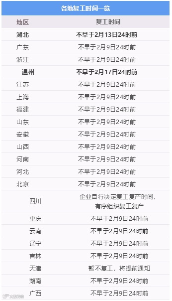 根据最新的消息,部分原定于2月10日开工的地区已经出现推迟情况。2月3日浙江发布的企业复工和疫情防控17条规定。该规定明确了企业复工前需经批准。