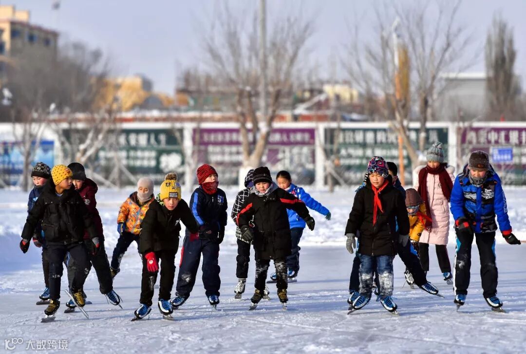2019年1月3日,新疆阿勒泰,福海县青少年活动中心,60余名小学生在零下20℃左右的低温环境中上体育课,在滑冰场上你追我逐。