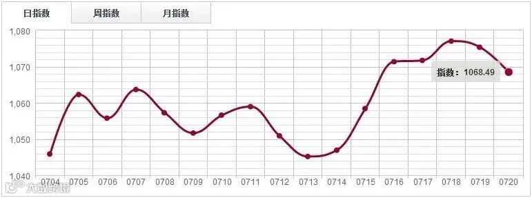 7月20日,中国木材指数(CTI)报收1118.66点,环比下跌0.47%。其中鱼珠木材指数(YTI)收于1033.31点,跌0.32%;福人木材指数(FTI)报收1274.55点,涨0.58%;大西南木材指数(DTI)报收977.60点,跌3.42%。