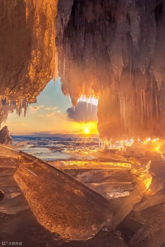 夕阳照射下的岩洞垂冰,金光闪闪~