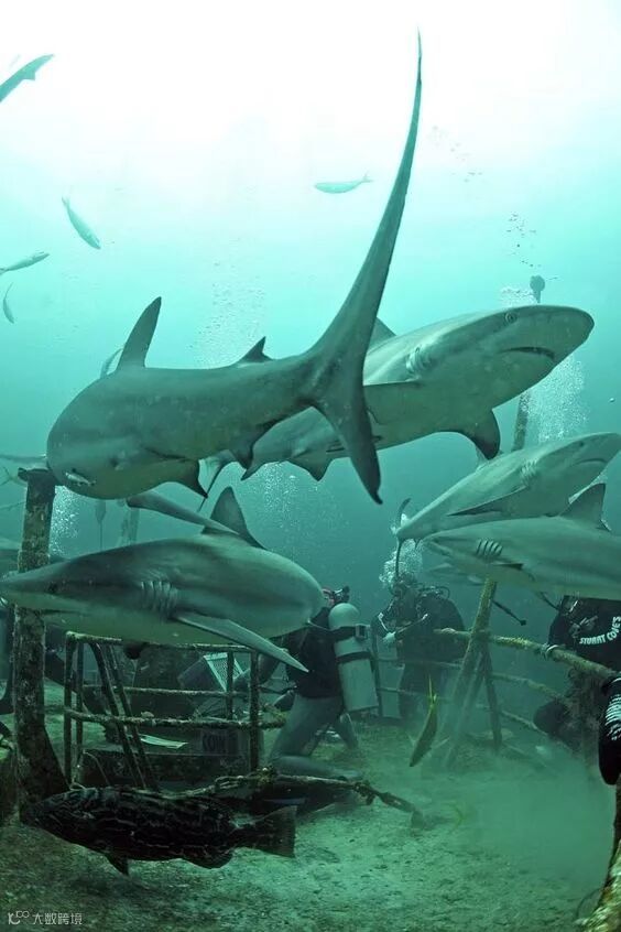 鲨鱼群中的潜水者,太敬业了~