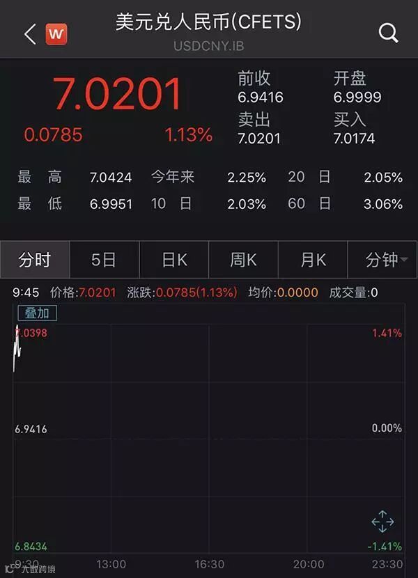 离岸人民币对美元汇率在中间价出炉后直线跳水,在在岸市场开盘前贬值至7.0421,较上一交易日6.9764的收盘价和今日6.9778的开盘价大跌超过600点。