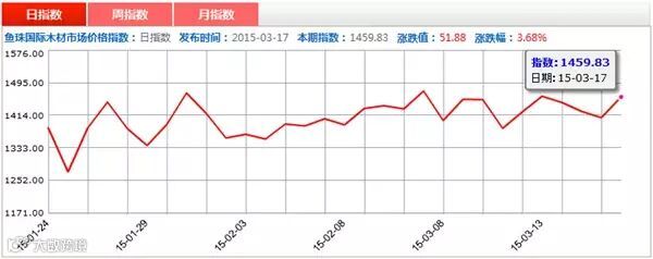 3月16日,鱼珠•中国木材价格指数报收1461.52点,环比上涨47.93点,涨幅为3.39%,同比下跌5.59%。红木分类指数报1675.72点,日环比跌79.49点,跌幅4.53%;原木分类指数报收1409.59点,环比上涨79.26点,涨幅为5.96%;锯材分类指数报收1459.83点,环比上涨51.88点,涨幅为3.68%;人造板指数报收1222.74点,上涨0.89%。