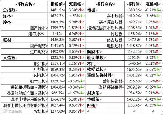 从盘面上看,人造板分类指数上涨动力十足,九种分类指数出现六涨三跌,其中三大主板集体飘红,引领人造板指数上涨。胶合板指数走势平稳,指数报收1339.11点,上涨1.16%,代表品市场缩量上涨行情较为明显,至收盘,代表品3厘和12厘板价格同时上涨了0.5元/张,分别报收29元和96.5元/张;15厘板价格报收114元/张,价格上涨了1元/张。中纤板指数高位震荡,报收1059.33点,上涨0.23%,代表品盘中成交不多,价格出现震荡调整,其中5厘和18厘板价格出现走跌,分别下跌了1元和0.5元/张;12厘板和15厘板价格上涨,同时上涨了1元/张,分别报收68元和75元/张。刨花板放量上涨,指数报收1504.72点,日环比上涨1.91%;同比上涨6.21%;成交量上涨了15.94%,交易额上涨13.91%。