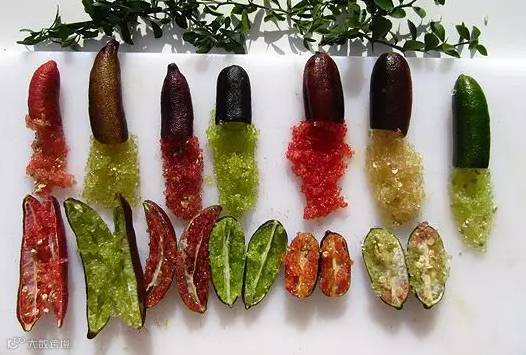 指橙是原产于澳洲的一种野果,主要以酸味为主。果肉包含于鱼子大小的小粒当中,号称水果中的鱼子酱。