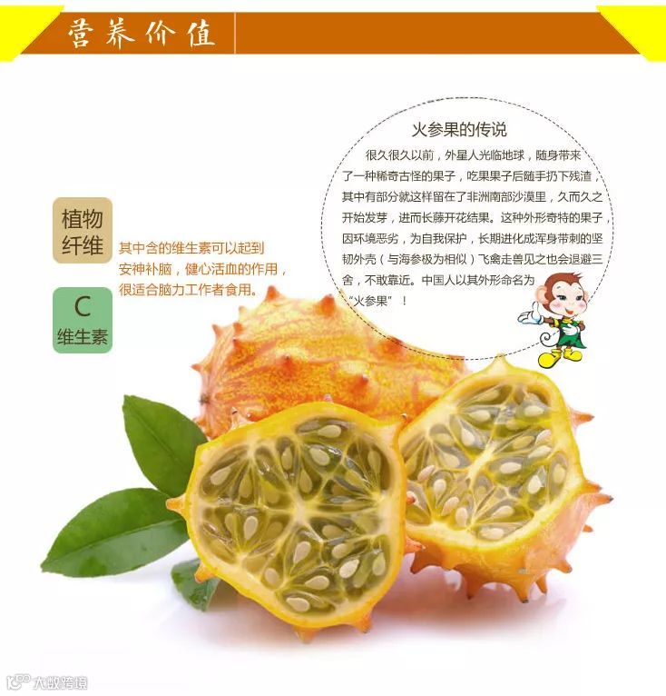 非洲角瓜又名火参果、刺角瓜,原产于非洲南部卡拉哈里沙漠地区,销售价格高达8~10元/个。