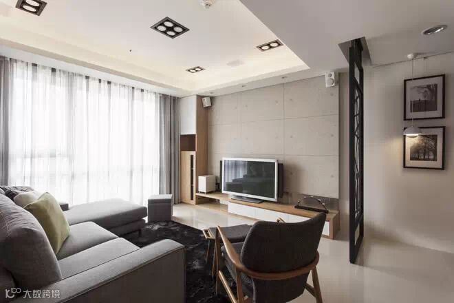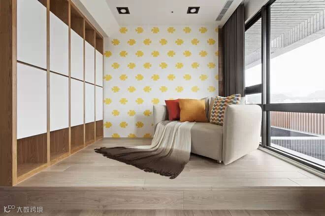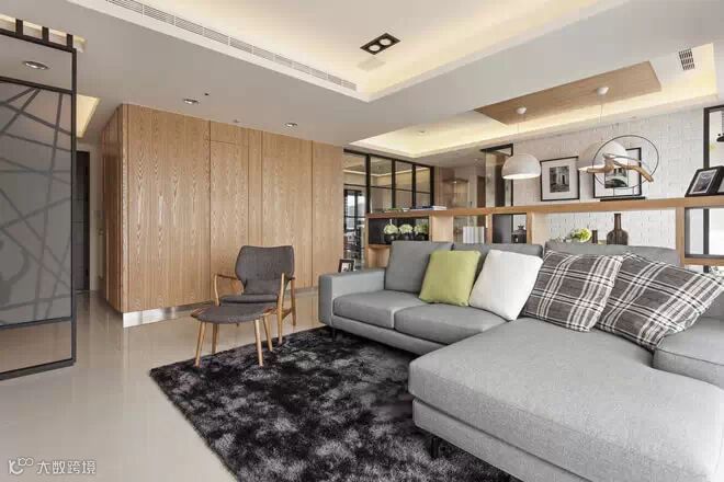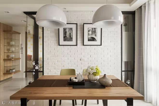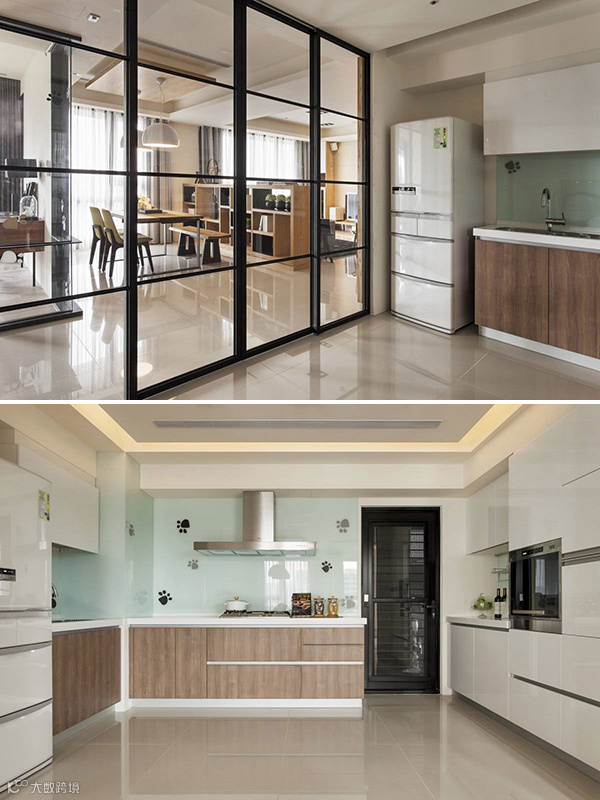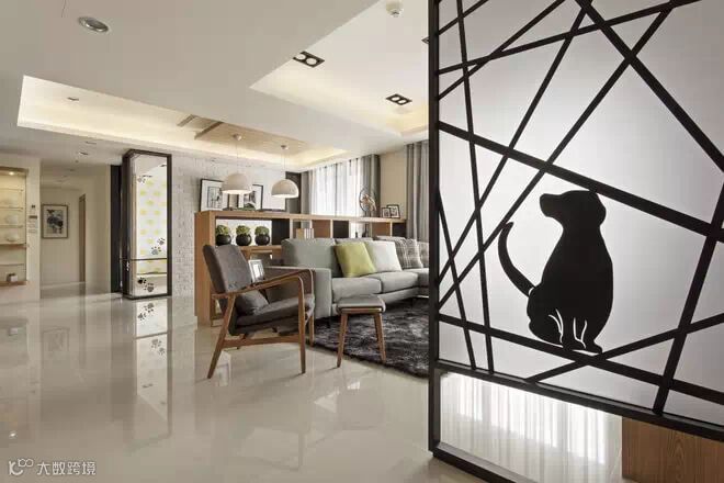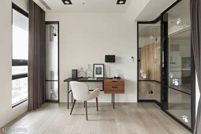 线条交错的铁件屏风上,狗狗造型图腾仿似在入门处等候主人的归来,将两隻宠物狗视為家庭成员的屋主,居家空间也须将狗狗们的使用需求纳入考量。从预售阶段即入场客变的格局,春雨设计在长型空间裡调整出妥适的机能格局,并藉由玻璃结合铁件的穿透式拉门,以及书房局部透光的设计手法,让充沛採光明亮与串联每一个独立空间。