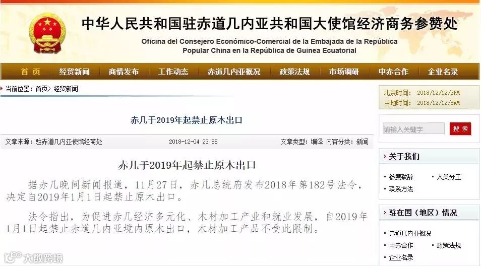 11月27日,赤几总统府发布2018年第182号法令,决定自2019年1月1日起禁止原木出口。法令指出,为促进赤几经济多元化、木材加工产业和就业发展,自2019年1月1日起禁止赤道几内亚境内原木出口,木材加工产品不受此限制。