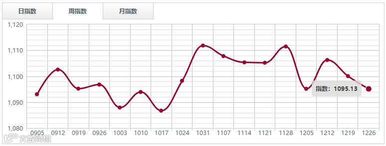 本周原木市场继续呈现弱势整理行情,周指数报收1095.13点,周环比跌4.93点,跌幅0.45%。全周销量环比下滑0.03%,交易额萎缩0.76%。