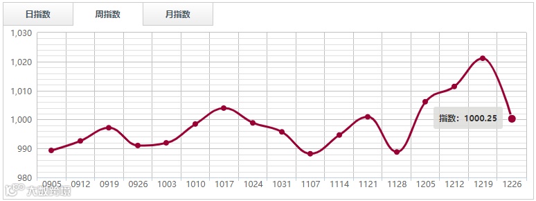 五大市场中,广东鱼珠价格指数(YTI)报收1147.00点,周环比下跌0.34%,全周销量环比上海0.15%,交易额上涨0.22%;上海福人木材价格指数(FTI)报收1366.14点,周环比上涨1.17%,全周销量环比微增加0.04%,交易额增加3.64%;大西南木材价格指数(DTI)报收1284.55点,周环比下跌3.82%,全周销量环下跌5.17%,交易额下跌3.08%;山东临沂木材价格指数(LTI)报收817.88点,周环比下跌1.91%,全周销量环比增加2.04%,交易额增加3.24%;江西南康木材价格指数(JTI)报收1619.51点,周环比微跌0.06%,全周销量环比微涨0.02%,交易额微跌0.03%。