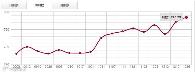 根据中国木材价格指数网监测数据显示,本周锯材分类指数报收796.79点,周环比涨2.8点,涨幅0.35%,全周销量环比增加1.11%,交易额增加0.73%。