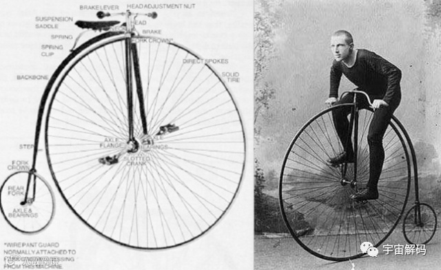 1888年第一辆现代自行车诞生,这个时候的自行车基本已经很完善了,在自行车的发展史中出现了各种奇形怪状的自行车,因为当时的人们认为轮子越大速度就越快,并且早期自行车的轮子不是前后放置,而是像轮椅一样左右放置的。