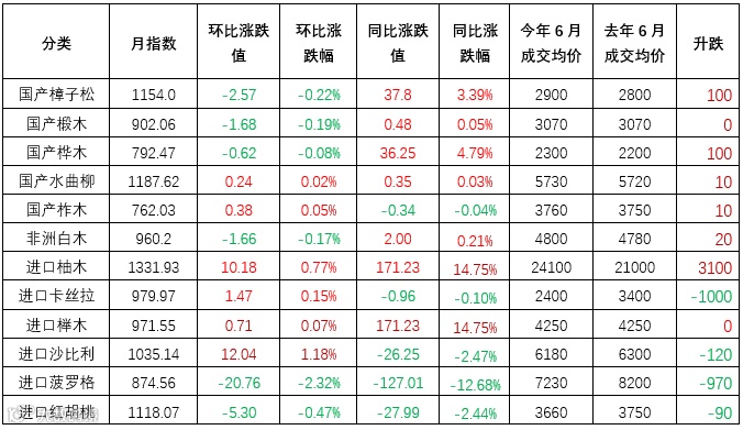 其余材种中榉木、沙比利行情也不佳,月销量环比萎缩7.86%、3.94%,成交价报收4250元/立方米、6200元/立方米,跌幅明显。有分析指出,6月份炎热的天气虽然对于阔叶材市场也会造成一定的影响,但是整体的影响不大,毕竟阔叶材主要用于室内装修,这也是阔叶材市场量能萎缩幅度没有针叶材大的主要原因。