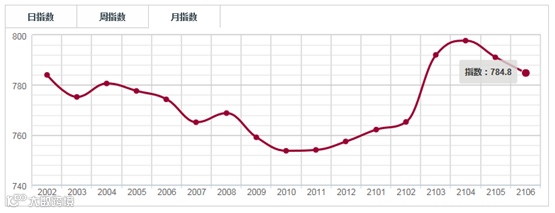 6月份,传统淡季氛围愈发浓郁,锯材分类指数走出绿盘调整行情,月指数报收784.80点,环比下跌0.79%。各大市场当中,广东鱼珠锯材指数报收1070.11点,环比上涨0.75%,上海福人锯材指数收于1219.41点,环比下跌0.78%,四川大西南锯材指数报收1059.44点,环比下跌3.78%,江西南康锯材指数收于1644.40点,环比下跌0.04%。