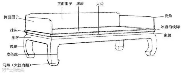 明清罗汉床的制作也有许多区别。大理石做围子是明代家具中不曾见的,其次是围子装石的形式也与清代施工手法大异其趣。从床腿亦可区分出是明作还是清作,明式鼓腿彭牙与清式的大挖缺做工区别完全在于对罗汉床腿的理解,是有力而含蓄,还是有力而夸张。总体上,明式罗汉床鼓腿彭牙腿足,给人有力度但十分含蓄,清式罗汉床的大挖缺腿足,在力度上多了活泼,略显夸张。