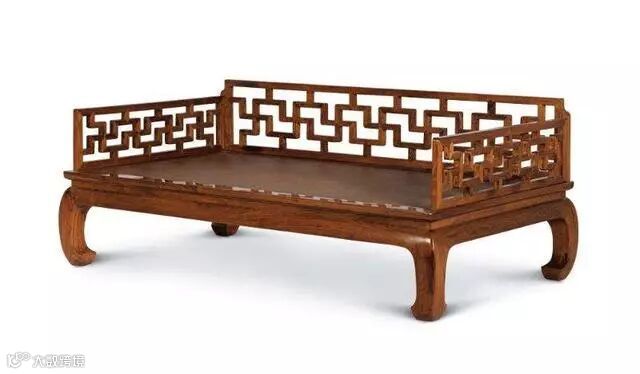 明代的罗汉床有束腰和无束腰两种:有束腰多为鼓腿彭牙大挖内翻马蹄,无束腰则为直腿式。罗汉床的差别主要表现在围子的做法上,最简捷朴质的只有三块光素的整板,正中一块稍高,或有的整板加一些浮雕花纹;另一种是围子四周有边框,中部用短材攒接出各种各样的花纹。
