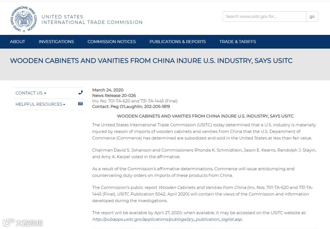 当地时间3月25日,美国国际贸易委员会USITC宣布5:0全票通过的最终裁定结果显示,将对进口自中国的浴室柜、橱柜征收反倾销税和反补贴税。