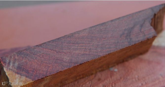 上图为大红酸枝南部料老料,中间一块黑筋占一半宽度,但右边这一块黑筋并不明显,这说明用黑筋粗细来判别是否大红酸枝是靠不住的,也是典型的外行识别方法。