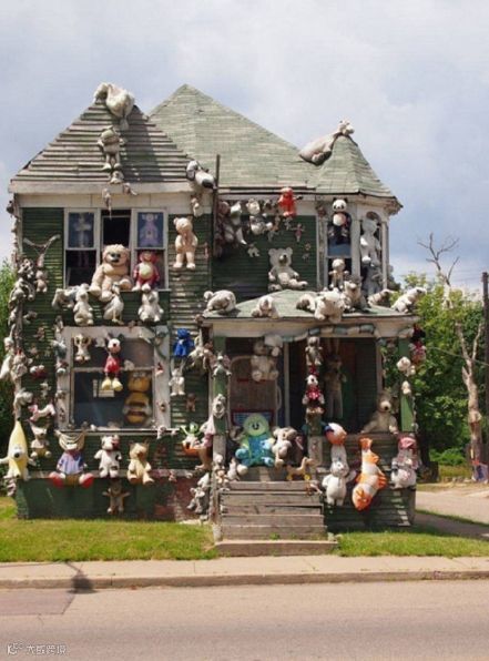 挂满毛绒玩具的屋子,显得颇为怪诞。