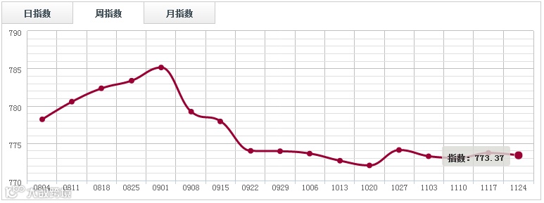 本周锯材市场呈现出弱势震荡态势,周指数报773.37点,周环比跌0.32点,跌幅0.04%,全周销量环比增加0.41%,交易额增加0.25%。
