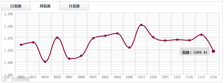 本周红木市场持续震荡格局,周指数报1269.41点,周环比跌6.76点,跌幅0.53%。广东鱼珠、上海福人、四川大西南周指数分别下滑0.18%、3.48%、0.28%。市场人士表示,临近年底,市场经历一个阶段性放量行情之后,红木市场再度回归平静。目前红木经营者年底补仓备货方面是较为谨慎的,这于后市看空不无关系。