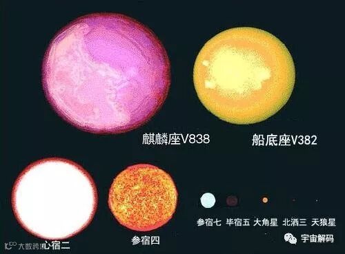 除了黑洞之外,宇宙中最大的星球是大犬座VY恒星,直径约为太阳2200倍,体积约为太阳80到100亿倍,质量接近太阳100倍。如果将它置于太阳系现在的位置,它的边缘将直达天王星的轨道。虽然它只距离我们5000光年,不过因为星际云团的阻挡我们肉眼看不到它。大犬座VY是一颗濒临死亡的红超巨星。