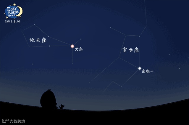 大角星即牧夫座α星,是牧夫座中最亮的恒星,距太阳系约35光年。大角星是一颗K2III型橙色巨星,直径约2923.2万公里,为太阳的21倍。大角星的亮度是太阳的100多倍,在夜空中排第4位。