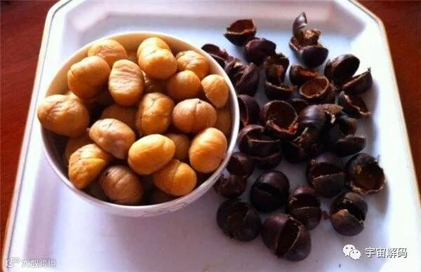 17.栗子皮难剥,先把外壳剥掉,再把它放进微波炉转一下,拿出后趁热一搓,皮就掉了;