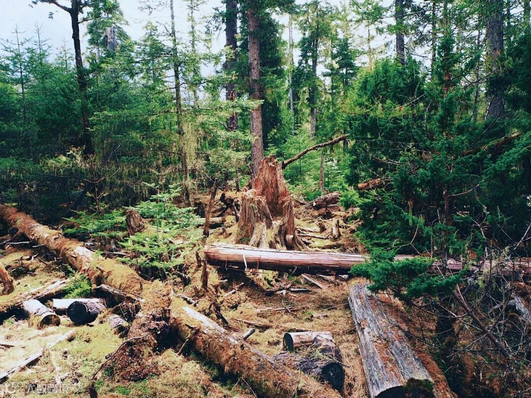 路边搁置的巨大圆木,静静地躺在野草花之中,诉说着一段古老与沧桑……