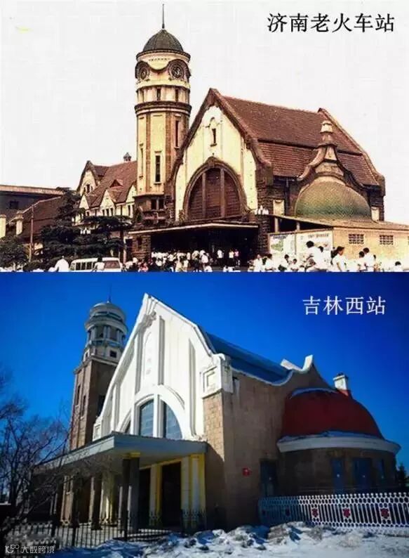林徽因设计、梁思成审定的吉林西站在1928年建成,几乎完全模仿了老济南火车站的设计,却远没有后者精致丰富: