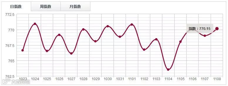 11月8日,中国木材指数(CTI)报收1223.73点,涨3.23点,涨幅0.26%。广东鱼珠木材指数(YTI)收于1071.59点,涨3.30点,涨幅0.31%;上海福人木材指数(FTI)报收125925点,涨9.39点,涨幅0.75%;四川大西南木材指数(DTI)报收1167.94点,涨1.30点,涨幅0.11%;山东临沂木材指数(LTI)报收889.03点,涨1.83点,涨幅0.21%;中国南康木材指数(JTI)报收1686.48点,环比下跌2.56点,跌幅0.15%。