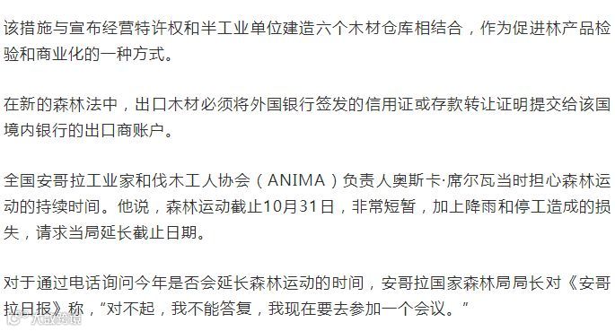 声明称,根据“森林和野生动物保护法”设立林产品仓库,旨在促进木材和其他出口产品的规范化。所以,木材和其他林产品的出口必须通过木材仓库进行,包括任何国家或外国公民拥有的安哥拉公司。