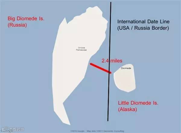▲左边属于俄罗斯,右边属于美国。国际日期变更线就在这2个岛之间。你要是从一个岛看另一个岛的人的话,你会发现他们活在昨天,而他们看你是活在明天的人……