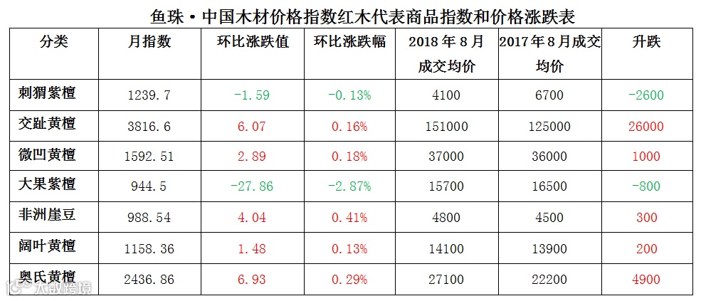 尽管在8月底市场有放量迹象,却也掩不住市场疲态。根据中国木材价格指数网监测数据显示,本月红木市场低迷情绪较浓,月指数未能实现红盘,报1297.41点,月环比跌8.06点,跌幅0.62%。并且在成交量方面,由于市场需求动力不足,月销量环比下滑0.99%,交易额萎缩0.17%。