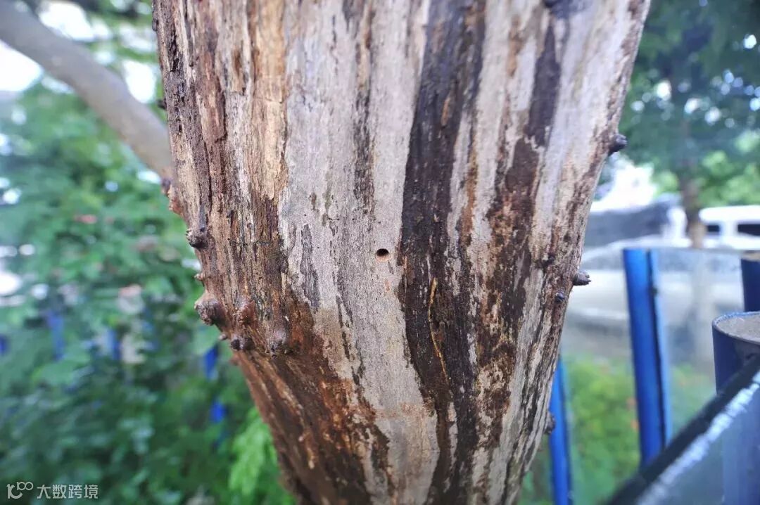 在现场,记者也注意到,该株黄花梨树干上有人工钻孔痕迹,每隔半米左右都会有一个直径约半厘米的圆孔。