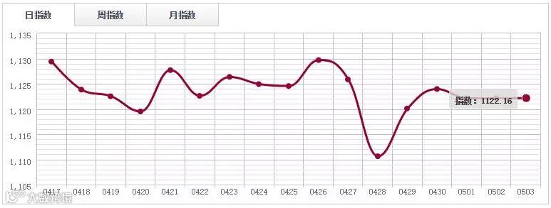 5月3日,中国木材指数(CTI)报收1206.11点,跌1.34%。广州鱼珠木材指数(YTI)收于1124.01点,跌0.25%;上海福人木材指数(FTI)报收1249.12点,跌0.71%;四川大西南木材指数(DTI)报收1284.27点,跌4.37%;中国南康(JTI)报收1717.48点,微涨0.01%。