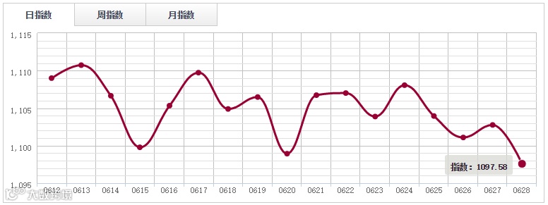 6月28日,中国木材指数(CTI)报收1205.99点,跌0.39点,跌幅0.03%。广州鱼珠木材指数(YTI)收于1104.96点,跌0.45%;上海福人木材指数(FTI)报收1245.05点,跌0.79%;四川大西南木材指数(DTI)报收1329.93点,涨2.13%;中国南康木材指数(JTI)报收1693.70点,跌0.08%,平稳。