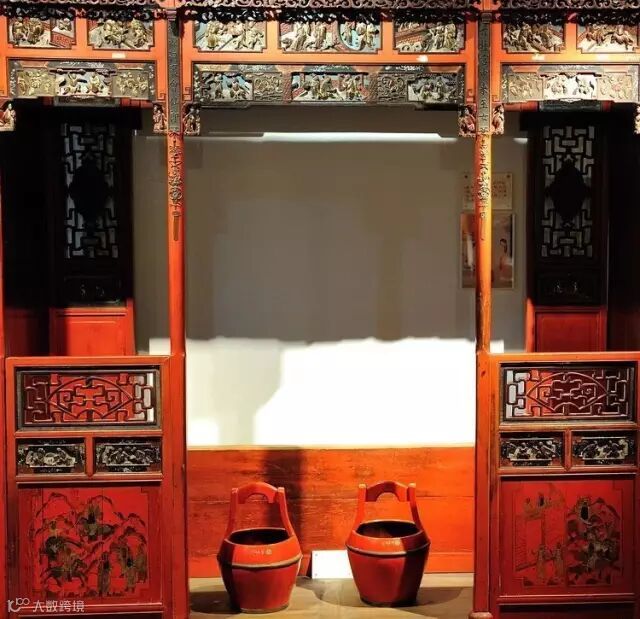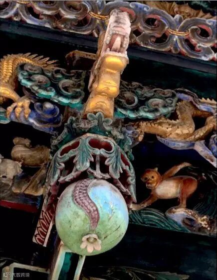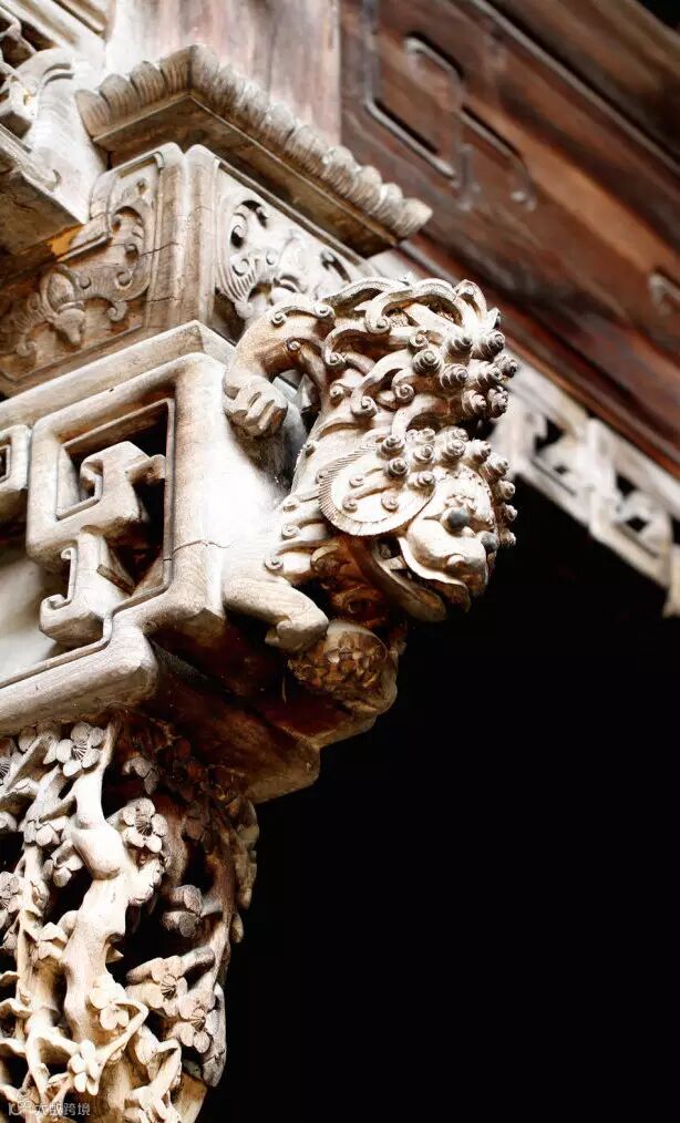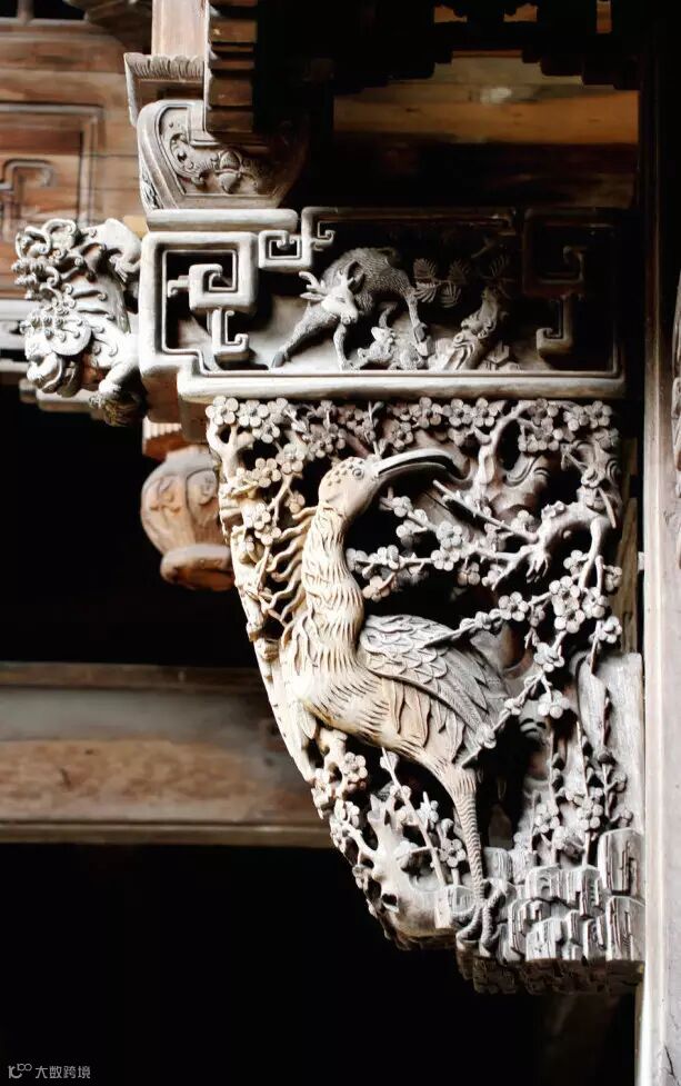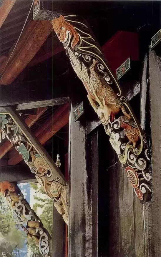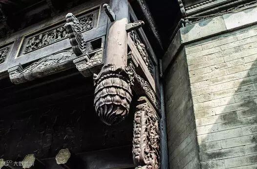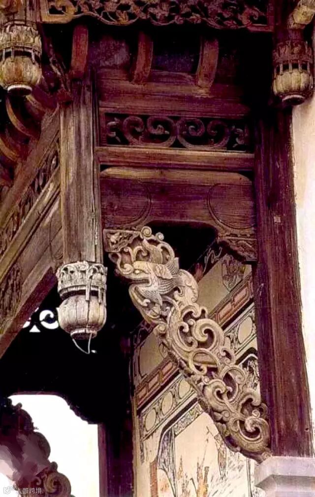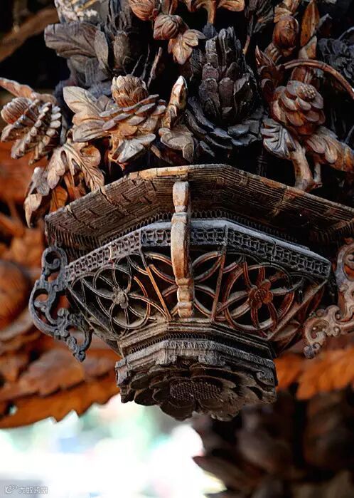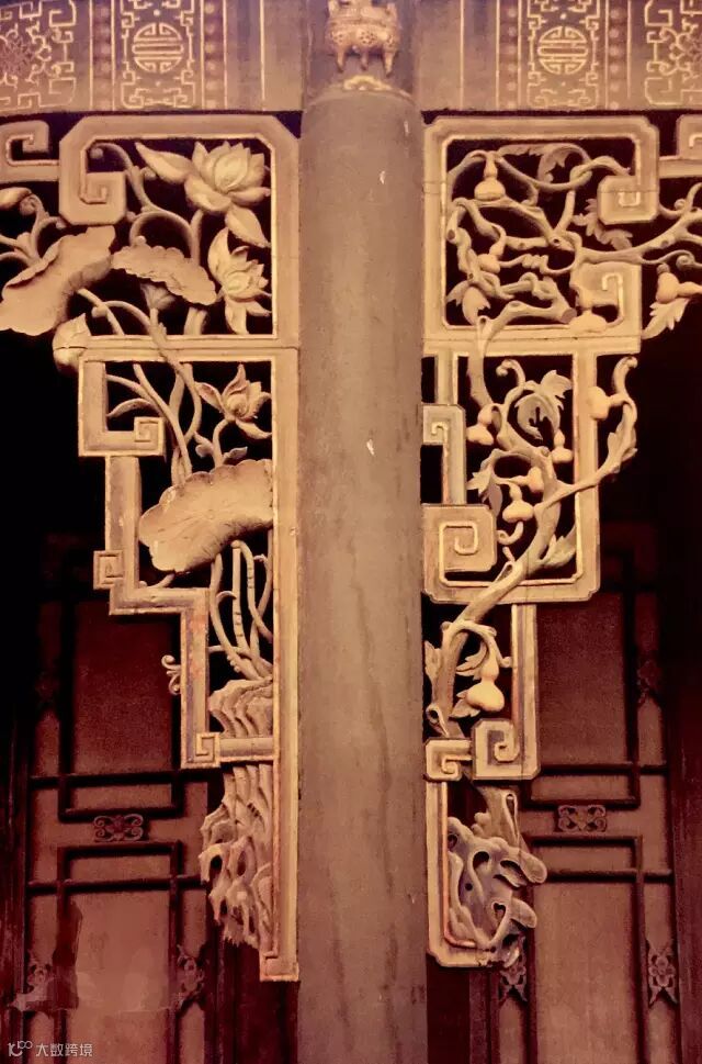 还有的在檐额下两柱之间产生了一种贴附在两柱内侧和檐额底边的延续木雕装饰,挂在檐额之下,沿着柱身向两边落下,称为挂落,其装饰性比雀替强。