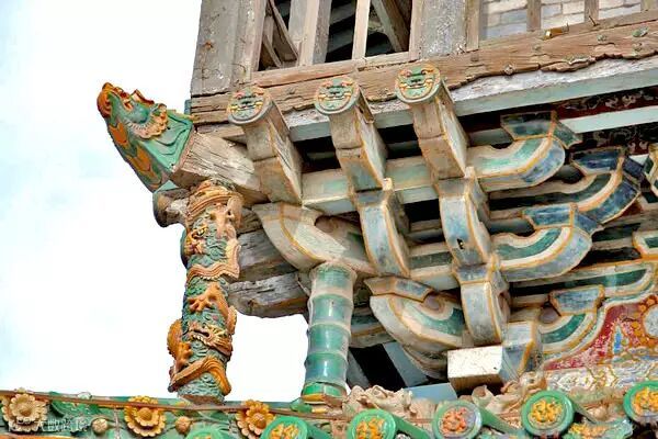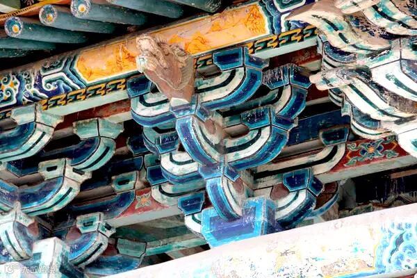斗栱是中国古代木结构建筑特有的一种构件,它是由许多小块方形的斗和拱形的栱拼合而成的构件,常用在屋檐下与梁枋之间,它的作用一是在屋檐下支撑伸出的屋顶檐部,减少雨水对屋身墙面与门窗、立柱的侵蚀;二是传递由上而下的荷重。