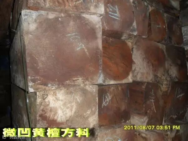 宏观特征:微凹黄檀的心材呈橙色或红褐色,有深色不规则的纹理。边材呈奶黄色,与心材之间有明显差别。