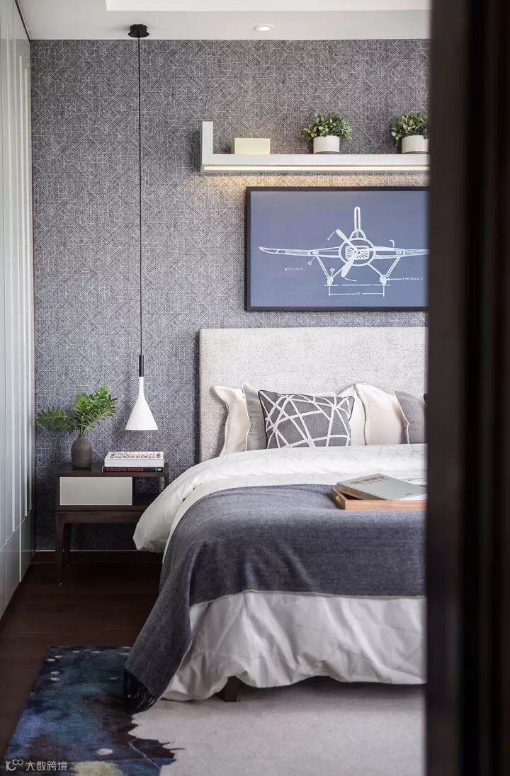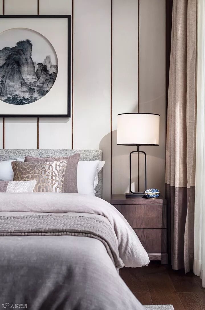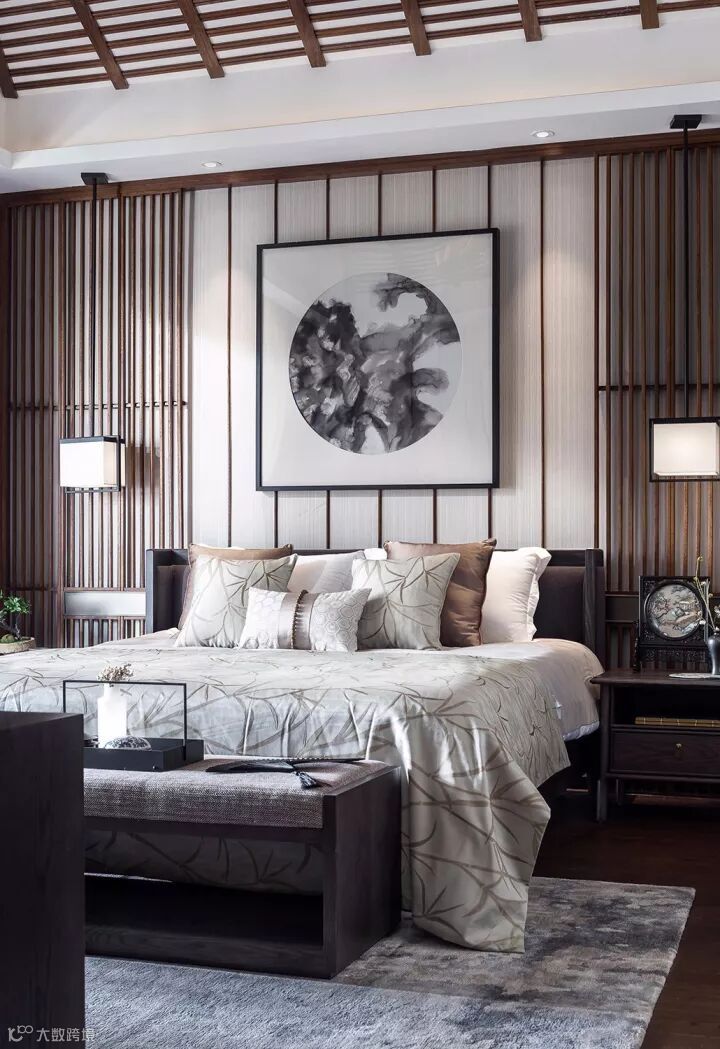 二层作为长辈房与家庭娱乐区域,与整个空间的步调一脉相承。三层主卧是本套户型的最大亮点。卧室背景墙采用细木条竖向分割,简洁明朗的木质格栅、时尚稳重的家具以及暖色的灯光氛围,使空间兼具温馨舒适与典雅贵气。