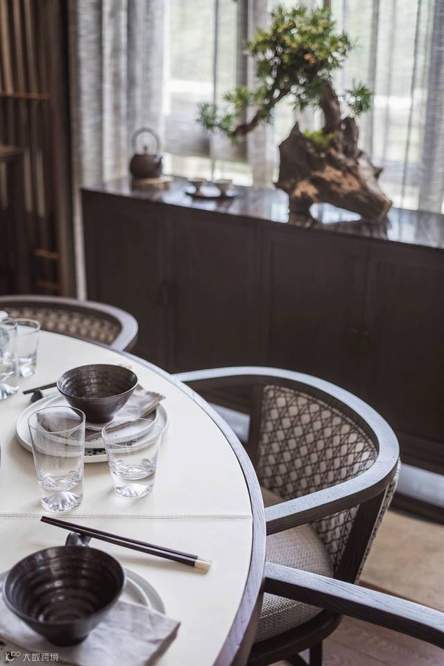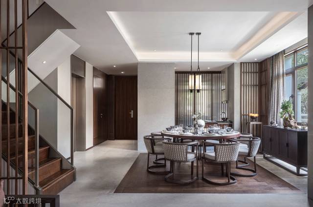 客厅中空挑高,二楼起居室与楼下对望。餐厅设计不仅延续了含蓄、高雅的生活方式与礼制之道,提炼出经典元素加以简化和丰富,圆形实木餐桌更显简约与流畅,人性化布局搭配触感顶级的材质,营造安静、舒适的用餐空间。