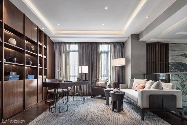 入口玄关的空间规划恰到好处地实现了储藏和展示的双重功能。客厅整体设计极力呈现别墅空间雅致、安静的力量。满墙书架式设计作为立面极具震撼力的精神载体,搭配水墨挂画让整体空间大气凝远、通达而有识鉴。