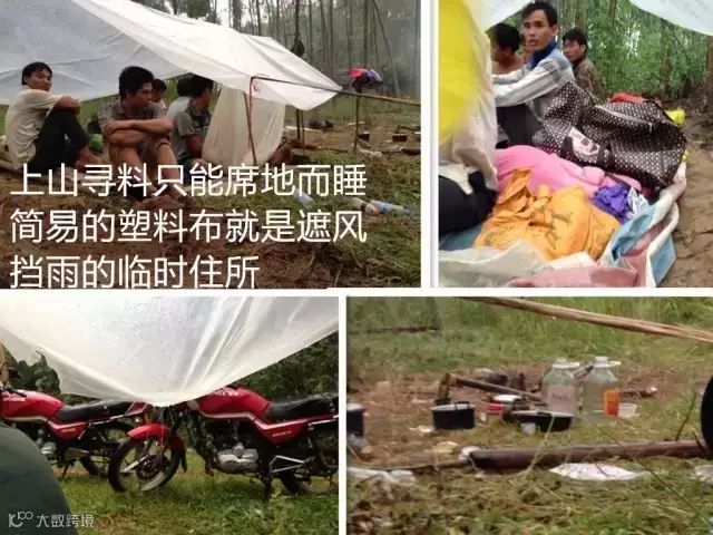 早饭后从山脚下的营地出发,每个人拿着刀、铲、锄头上山,往不同方向的山洞里钻,地毯式的搜索,只要有坑的地方都要挖上一会,或者每走一小段路就要停下来扫一些烂树枝来烧火,为什么呢?
