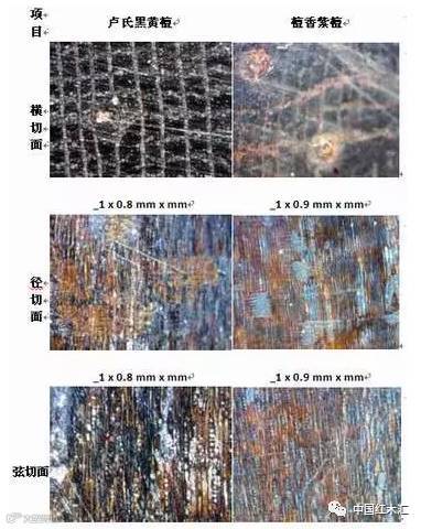 横切面对比说明:卢氏黑黄檀轴向薄壁组织,主为同心层型的细线(宽1~2细胞),且排列规整。檀香紫檀轴向薄壁组织,主为同心层式或略带波浪形的细线(宽1~2细胞),稀环管束状。