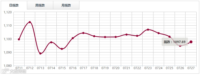 7月27日,中国木材指数(CTI)报收1153.46点,环比下跌0.39%。其中鱼珠木材指数(YTI)收于1100.22点,涨0.13%;福人木材指数(FTI)报收1242.96点,跌0.89%;大西南木材指数(DTI)报收1080.94点,跌0.29%;南康木材指数(JTI)报收1725.72点,涨0.16%.